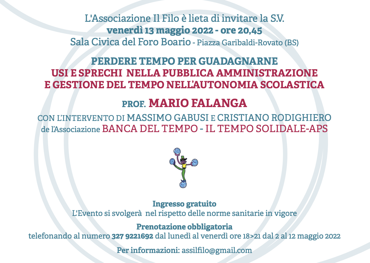 L’Associazione rovatese Il Filo – dopo gli appuntamenti dedicati al Linguaggio e all’Ascolto – affronterà quest’anno il tema dell’Azione nel suo aspetto legato al Tempo come risorsa quanto mai preziosa.