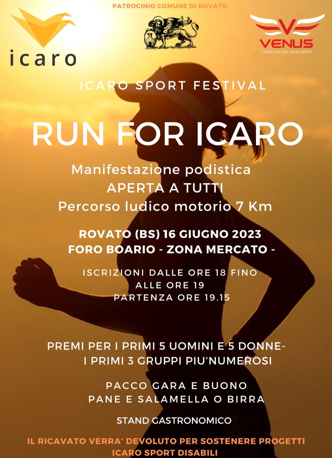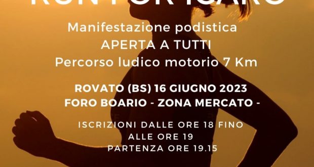 Venerdì 16 giugno, a Rovato, si terrà Run for Icaro, manifestazione podistica aperta a tutti che si snoderà lungo un percorso di 7 chilometri. La partenza sarà alle 19.15 nella zona del mercato. Informazioni nella locandina seguente.