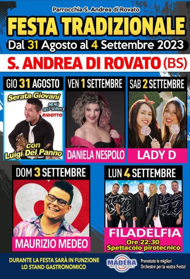 Dal 31 agosto al 4 settembre, a Rovato, torna la Festa di Sant’Andrea. Tutte le sere sarà in funzione lo stand gastronomico, con musica dal vivo. Nella serata finale non mancherà l’atteso spettacolo pirotecnico delle 22.30.