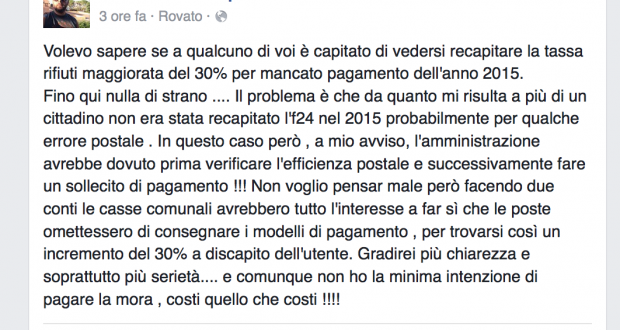“Volevo sapere se a qualcuno di voi è capitato di vedersi recapitare la tassa rifiuti maggiorata del 30% per mancato pagamento dell’anno 2015.