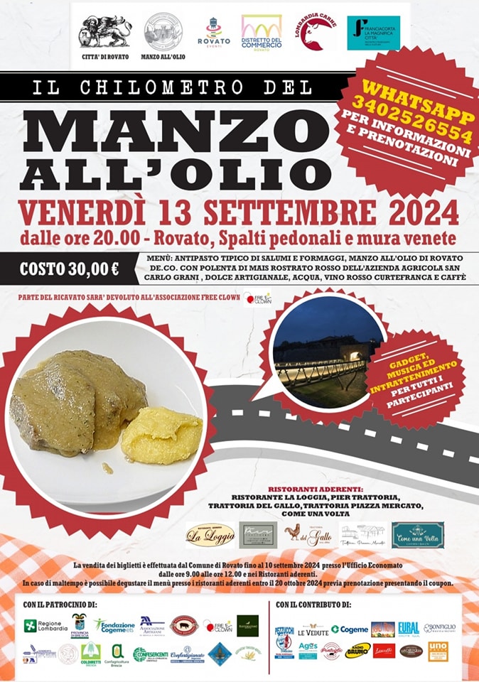Torna l’imperdibile appuntamento con sua maestà, il manzo all’olio di Rovato! Venerdì 13 settembre, nella splendida cornice degli spalti, di fronte alle mura venete e al ponte, si terrà il kilometro del manzo all’olio. Sono già aperte le prenotazioni. Buona compagnia, musica e soprattutto il piatto celebre di Rovato!